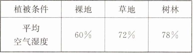 技巧与点拨 本实验探究的是不同植被类型对空气湿度的影响,因此实验变量是不同的植被条件。裸地上没有植物,在该探究中作为对照组。根据表格数据比较得出,树林的空气湿度高于草地的空气湿度;对照实验应遵循变量唯一的原则,因此除此植被条件之外,其他条件(如光照强度)均相同。
