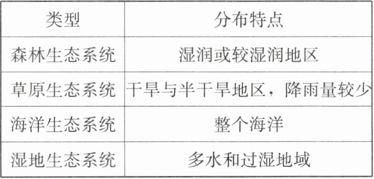12. 地球上生态系统种类多样,下表为森林、草原、海洋和湿地生态系统的分布特点,请据表回答下列问题。