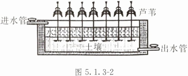 15. 某研究机构利用水池(4 米×2 米×1 米)、土壤、芦苇丛、水管等材料制作一个人工生态系统(如图 5.1.3 - 2 所示)。根据所学回答下列问题。