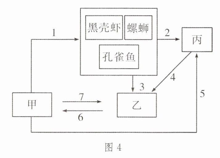 20. 生态瓶是一种微型生态系统。同学们利用绿萍、金鱼藻、黑壳虾、孔雀鱼、螺蛳、细沙、河水等设计了一个生态瓶,图4为该生态瓶的物质循环模式图(甲、乙、丙表示生态瓶中的成分,1~7表示某些生理过程)。请据图回答问题。