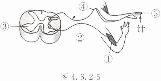 9. 图 4.6.2 - 5 表示缩手反射的反射弧,若②处受损不能传递兴奋,用针刺激⑤会出现的现象是( )。