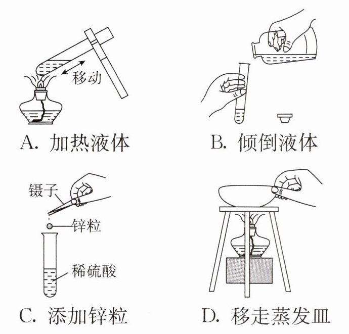 解析 给试管中的液体加热时,用酒精灯的外焰加热,且液体体积不应超过试管容积的 $\frac 13$,A 项正确;向试管中倾倒液体试剂时,瓶塞要倒放,标签要朝向手心,瓶口紧挨试管口,图中瓶口没有紧挨试管口、瓶塞没有倒放,B 项不正确;应先向试管中加入锌粒,再向试管中加入稀硫酸,向试管中加入锌粒时,先将试管横放,用镊子把锌粒放在试管口,再慢慢将试管竖立起来,C 项不正确;正在加热的蒸发皿温度较高,为防止烫伤手,应用坩埚钳夹取,D 项不正确。
