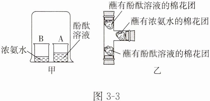 。解析 (1)浓氨水有挥发性,挥发出的氨分子不断运动,当运动到烧杯A中时,氨气溶于水形成氨水,能使无色酚酞溶液变红,故几分钟后,烧杯A中的溶液由无色变为红色。(2)与甲所示装置相比,乙所示装置为密闭容器,环保,且节约试剂。(3)用乙所示装置进行实验,上方的棉花团先变色,是因为氨气的密度比空气小,氨气聚集在上方。