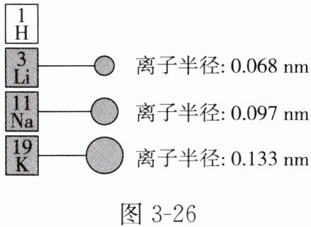 (填“阴”或“阳”)离子。锂(Li)、钠(Na)、钾(K)等金属很容易失去电子,所以常被用作电池材料。(2)研究表明,半径越大的金属离子越容易在电池正负极之间移动,充电速度越快。图3-26所示是锂、钠、钾三种金属离子的半径大小,电池容量相同的这三种电池,充满电的时间最短的是