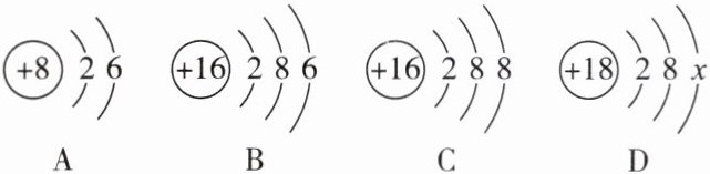 (2)C 粒子的质子数 = 16,核外电子数 = 18,质子数 < 核外电子数,为阴离子。原子中,质子数 = 核外电子数,若 D 是原子,则 $ x = 18 - 2 - 8 = 8 $。