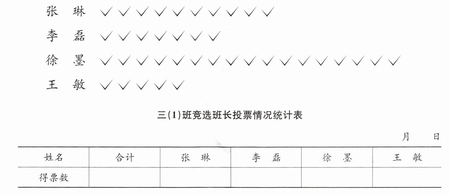 1. 三(1)班竞选班长,候选人是张琳、李磊、徐墨、王敏。全班同学进行投票,结果如下。先完成统计表,再根据统计表回答问题。(每人只投 1 票)