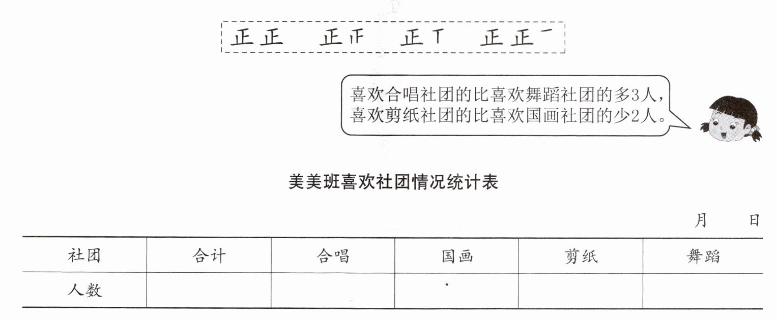 2. 学校准备开设合唱、国画、剪纸、舞蹈四个社团。美美用画“正”字的方法记录了自己班喜欢各种社团的人数,但她忘记了写社团名称。请你根据调查数据和提示完成下面的统计表,并回答问题。(每人只能选一个)