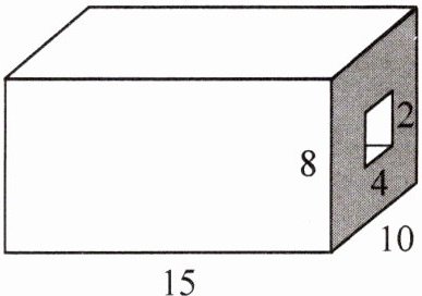 2. 计算挖掉的长方体孔体积:横截面面积为$4×2 = 8$(平方厘米),挖掘长度为原长方体的长15厘米(从一面向对面,对面距离为长),故挖掉体积为$8×15 = 120$(立方厘米)