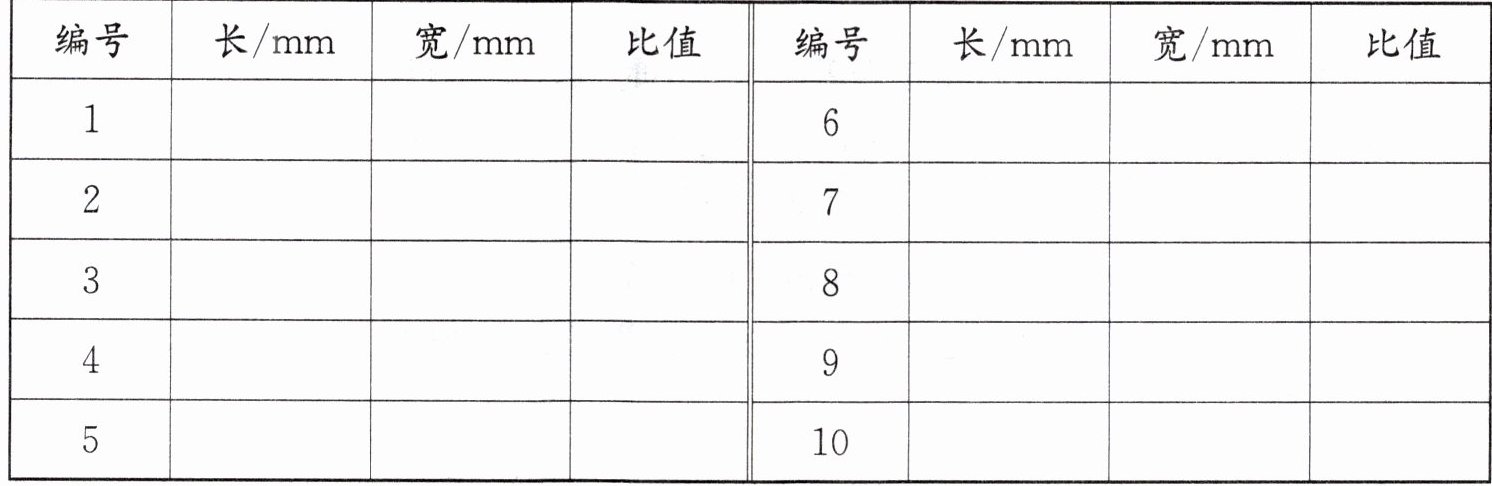 | 编号 | 长/mm | 宽/mm | 比值 |