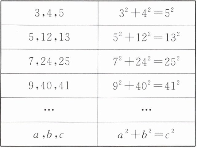 (1)题表各组数的共同点可以从以下几个方面分析:①题表各组数均满足a²+b²=c²;②最小的数a是奇数,其余的两个数是连续的正整数;③最小数a的平方等于另两个连续整数的和,如3²=9=4+5,5²=25=12+13,7²=49=24+25,9²=81=40+41,…。由以上特点我们可猜想并说明这样一个结论:设m为大于1的奇数,将m²拆分为两个连续的整数之和,即m²=n+(n+1),则m,n,n+1就构成一组简单的勾股数。因为m²=n+(n+1)(m为大于1的奇数),所以m²+n²=2n+1+n²=(n+1)²,所以m,n,n+1是一组勾股数。