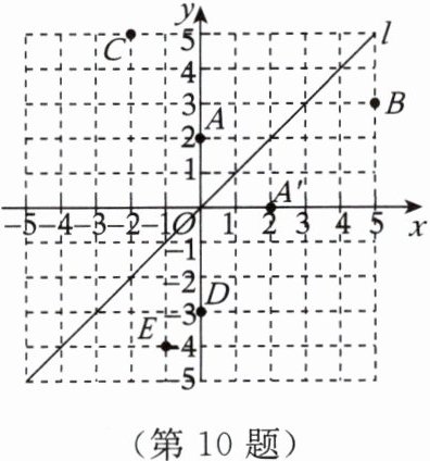 (1) 实验与探究:由图观察易知点 $ A(0,2) $ 关于直线 $ l $ 的对称点 $ A' $ 的坐标为 $ (2,0) $,请在图中分别标明 $ B(5,3) $, $ C(-2,5) $ 两点关于直线 $ l $ 的对称点 $ B' $, $ C' $ 的位置,并写出它们的坐标:$ B' $ ______, $ C' $ ______;