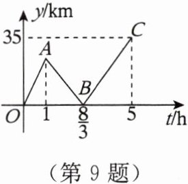 (1)1 h y=15x-40解析:由题中图象可知,甲比乙迟出发1 h。设线段BC所在直线的函数表达式为y=kx+b,根据题意,得{0=8/3k+b,35=5k+b,解得{k=15,b=-40。所以线段BC所在直线的函数表达式为y=15x-40。