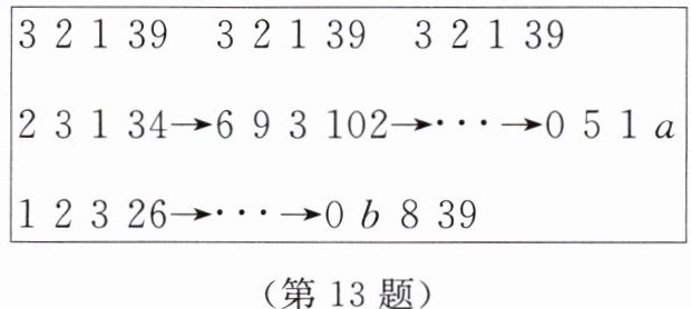 13. 【数学文化】《九章算术》是我国古代的数学专著,其“方程”一章中给出了“遍乘直除”的算法解方程组。比如,对于方程组 $\begin{cases}3x + 2y + z = 39, \\2x + 3y + z = 34, \\x + 2y + 3z = 26。\end{cases} $ 将其中数字排成长方形式,然后执行如下步骤(如图):第一步,将第二行的数乘 3,然后不断地减第一行,直到第二行第一个数变为 0;第二步,对第三行做同样的操作,其余步骤都类似。图中 $a$,$b$ 的值分别是(