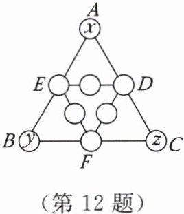 12. 【数学游戏】三角形幻方是锻炼思维的有趣数学问题,例:把数字 $1$,$2$,$3$,…,$9$ 分别填入如图所示的 9 个圆圈内,要求 $\triangle ABC$ 和 $\triangle DEF$ 的每条边上三个圆圈内数字之和都等于 18,则 $x + y + z$ 的和等于(