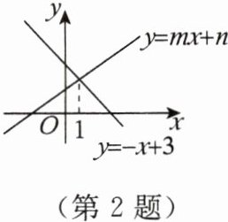 2. 如图,直线 $ y = -x + 3 $ 与 $ y = mx + n $ 交点的横坐标为 1,则关于 $ x $,$ y $ 的二元一次方程组 $\begin{cases}x + y = 3,\\-mx + y = n\end{cases} $ 的解为(