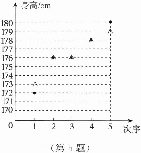 5. 在篮球场上五名同学正在进行比赛,将场上五名队员的身高绘制成如图所示的统计图,其中“$\triangle$”是换人前五名队员的身高,“•”是换人后五名队员的身高。与换人前相比,换人后场上队员的身高(