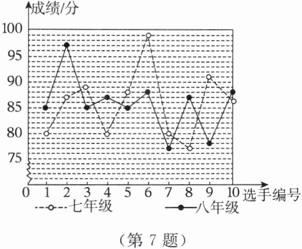 7. 某区举行“我的中国梦”演讲比赛,某校中学组根据初赛成绩在七、八年级分别选出 10 名同学参加比赛,这些选手的决赛成绩如图所示。