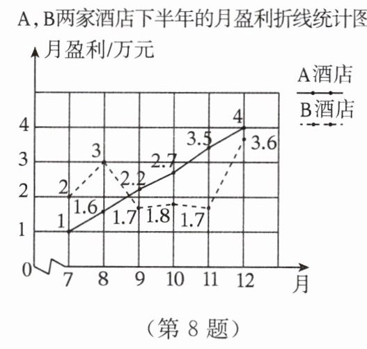 8. A,B 两家酒店规模相当,去年下半年的月盈利折线统计图如图所示。