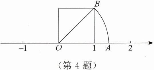 4. 学习实数时,教师在黑板上画出图形(如图),并写出了画法:以数轴的单位长度为边作一个正方形;以原点 $ O $ 为圆心、正方形对角线 $ OB $ 为半径画弧与数轴正半轴交于点 $ A $。请写出点 $ A $ 表示的数 $ a $ 满足的一个等式。