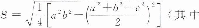 当$a=\sqrt{5}$,$b=3$,$c=2\sqrt{5}$时,$a^{2}=5$,$b^{2}=9$,$c^{2}=20$,所以$S=\sqrt{\frac{1}{4}×\left[5×9-\left(\frac{5+9-20}{2}\right)^{2}\right]}=\sqrt{\frac{1}{4}×\left[45-(-3)^{2}\right]}=\sqrt{\frac{1}{4}×(45-9)}=\sqrt{\frac{1}{4}×36}=3$。所以三角形的面积为3。