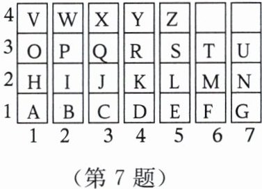 7. 有一个英文单词的字母顺次对应的图中有序数对分别为(3,1),(1,2),(2,2),(7,2),(1,1),把这个英文单词写出来或翻译成中文为
