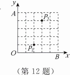 12. 【综合与实践】如图,将 $5 × 5$ 的方格纸放置在平面直角坐标系 $xOy$ 中,格点 $A$ 的坐标为 $(0,5)$,格点 $B$ 的坐标为 $(5,0)$,顺次连接点 $A$,$P_1(1,m)$,$P_2(2,1)$,$P_3(3,4)$,$P_4(4,n)$ 和 $B$ 所得的折线段恰好平分该方格纸的面积,写出 $m$,$n$ 应满足的数量关系。