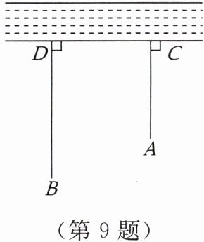 9. 如图,牧民在河边A处放牛,家在河边B处,时近傍晚,牧民驱赶牛群先到河边饮水,然后在天黑前赶回家。已知点A到河边C的距离为500m,点B到河边D的距离为700m,CD= 500m。