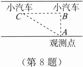 8. 【数学应用】《中华人民共和国道路交通管理条例》规定:小汽车在城市街路上行驶速度不得超过70km/h。如图,一辆小汽车在一条笔直的城市街路上直线行驶,某一时刻刚好行驶到路对面车速检测仪A正前方30m的B处,过了2s后,测得小汽车(C)与车速检测仪A之间的距离为50m,这辆小汽车超速了吗?
