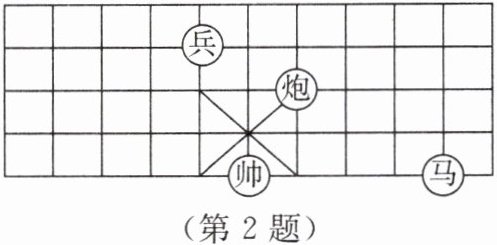 2. 【数学文化】中国象棋是中华民族的文化瑰宝,因趣味性强,深受大众喜爱。如图,在象棋棋盘上建立平面直角坐标系,若“帅”位于点 $ (0,-2) $,“马”位于点 $ (4,-2) $,则“兵”位于点的坐标是