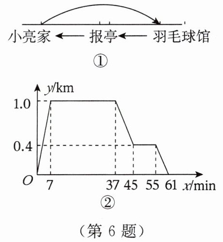 6. 如图①,小亮家、报亭、羽毛球馆在一条直线上。一天,他从家跑步到羽毛球馆打羽毛球,之后去报亭看报,最后散步回家。小亮离家路程 $ y $(单位:$ km $)与时间 $ x $(单位:$ min $)之间的关系如图②所示。则下列结论不正确的是(