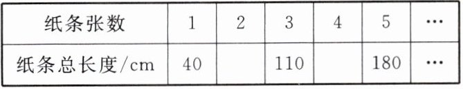 | $ 180 $ | …$ $ |(2)设 $ x $ 张纸条黏合后的总长度为 $ y \, cm $,写出 $ y $ 与 $ x $ 之间的函数关系式。