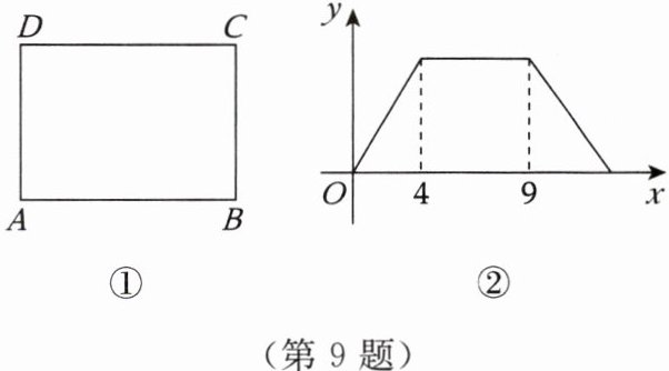 9. 如图①,在长方形 $ ABCD $ 中,动点 $ P $ 从点 $ B $ 出发,沿 $ BC $,$ CD $,$ DA $ 运动至点 $ A $ 停止。设点 $ P $ 运动的路线长为 $ x $,$ \triangle ABP $ 的面积为 $ y $,$ y $ 关于 $ x $ 的函数图象如图②,则 $ \triangle ABC $ 的面积等于