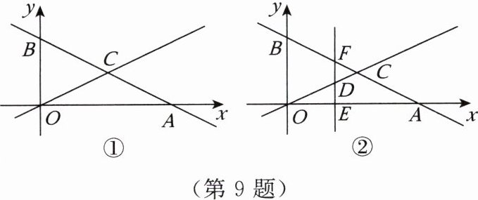 9. 如图①,一次函数 $ y = -\frac{1}{2}x + 6 $ 的图象分别交 $ x $ 轴、$ y $ 轴于 $ A $,$ B $ 两点,正比例函数 $ y = \frac{1}{2}x $ 的图象与直线 $ AB $ 交于点 $ C(m,3) $。