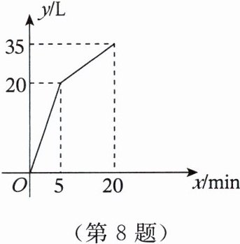 8. 【数学应用】一个有进、出水管的容器,单位时间进、出的水量都是一定的。设从某时刻开始 $ 5 $ min 内只进水不出水,在随后的 $ 15 $ min 内既进水又出水,水量 $ y $(单位:L)与 $ x $(单位:min)之间的函数图象如图。若 $ 20 $ min 后只出水不进水,求这时 $ y $ 与 $ x $ 的函数关系式。