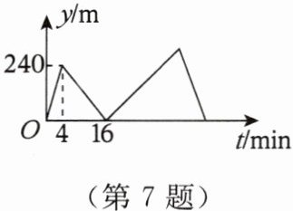 7. 【数学应用】甲、乙两人在笔直的公路上同起点、同终点、同方向匀速步行 $ 2400 \mathrm{m} $,先到终点者就地休息。已知甲先出发 $ 4 \mathrm{min} $,在整个步行过程中,两人之间的距离 $ y $(单位:$\mathrm{m}$)与甲出发的时间 $ t $(单位:$\mathrm{min}$)之间的关系如图所示。