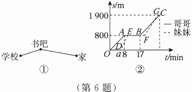 6. 【数学应用】兄妹俩放学后沿图①所示的路线从学校出发,到书吧看书后回家。哥哥步行先出发,途中速度保持不变;妹妹骑车,到达书吧前的速度为 $ 200 \mathrm{~m}/\mathrm{min} $。图②中的图象分别表示两人离学校的路程 $ s $(单位:$ \mathrm{m} $)与哥哥离开学校的时间 $ t $(单位:$ \mathrm{min} $)的函数关系。