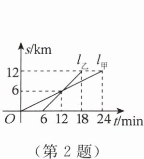 2. 甲、乙二人以相同路线前往离学校 $ 12 $ km 的地方参加植树活动。如图,$ l_{甲} $,$ l_{乙} $ 分别表示甲、乙二人前往目的地所行驶的路程 $ s $(单位:km)随时间 $ t $(单位:min)变化的函数图象。请根据图象回答下列问题: