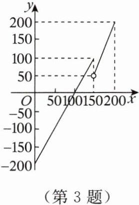 3. 一家小型放映厅盈利额 $ y $(单位:元)同售票数 $ x $ 之间的关系如图,当地消防部门规定:超过 $ 150 $ 人时,要缴纳公安消防保险费 $ 50 $ 元。请解决下列问题: