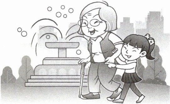 □ 洋洋的奶奶从外地来,她周末当小导游陪奶奶去公园玩。