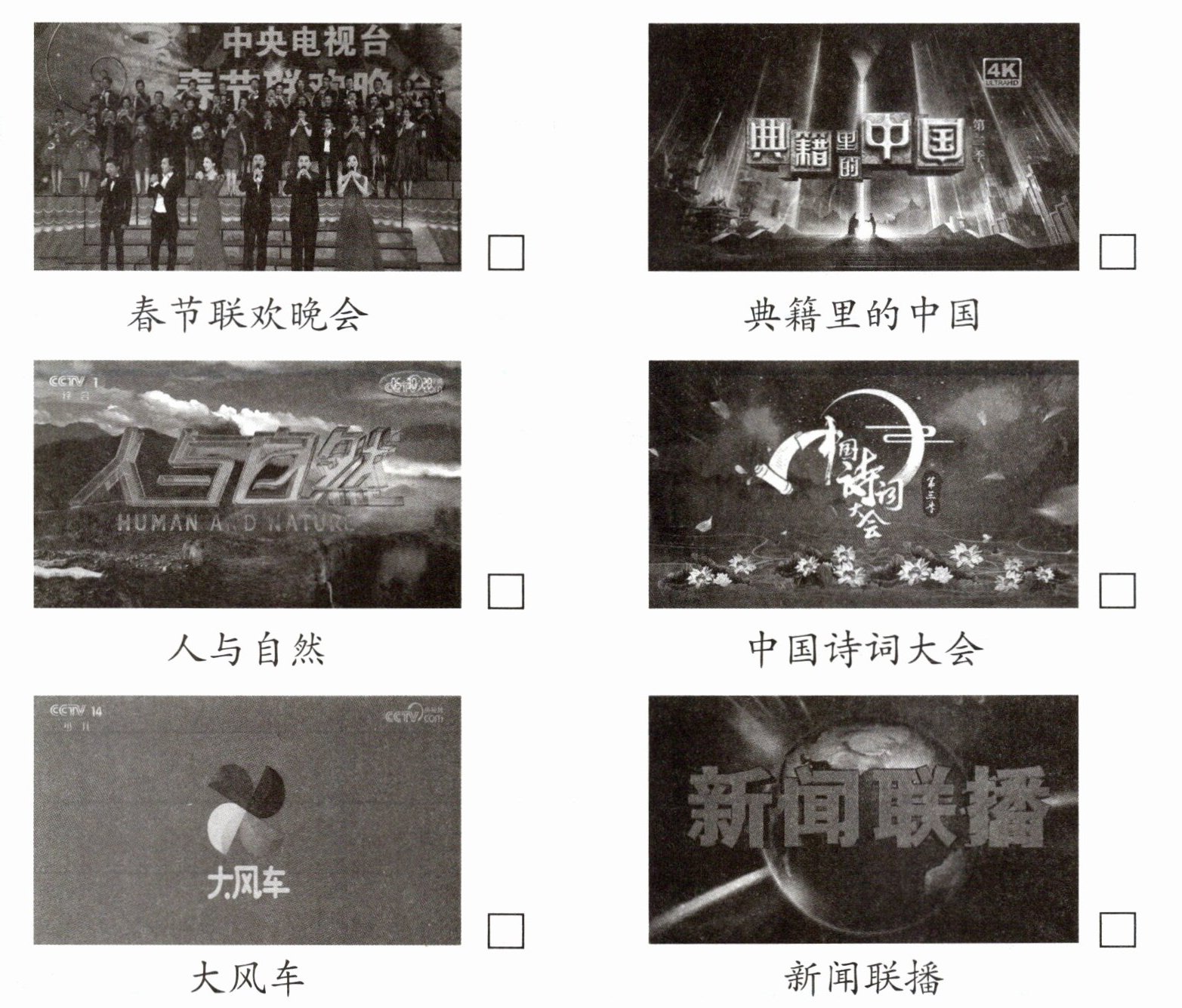 1. 下面的电视节目你看过吗?请在你看过的节目旁打“√”,并选出一个你最喜爱的节目,和同学交流分享。