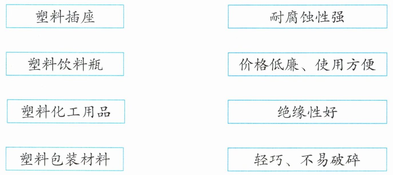 2. 塑料制品能够被广泛使用,在于其具有多种优点。请把下列日常塑料制品与其优点用线连起来。