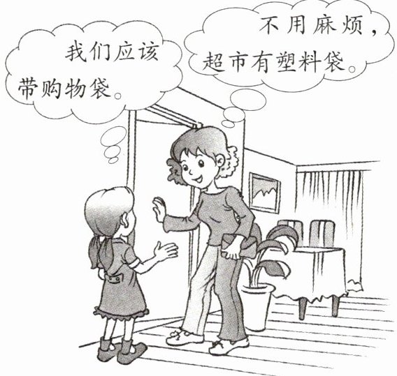 我想对妈妈说:妈妈,虽然超市有塑料袋,但是塑料袋难以降解,会造成“白色污染”,对环境危害很大。我们应该自带购物袋,这样更环保,能为保护环境出一份力。