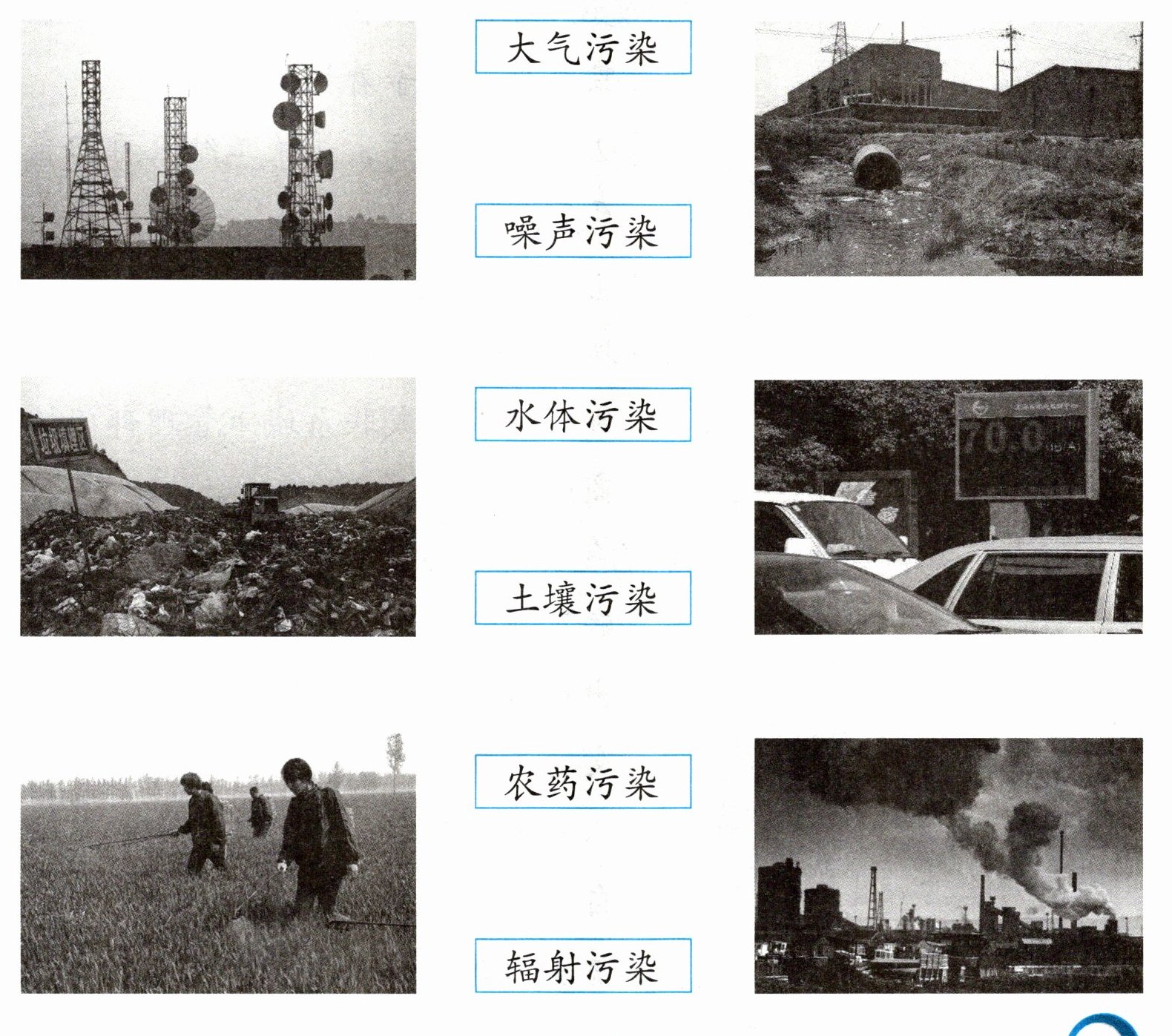 1. 我们的家园正在遭受着前所未有的污染,这些污染极大地损害了人们的健康,严重地威胁着地球生态环境和人类的生存。请用线把图片和对应的污染类型连起来。