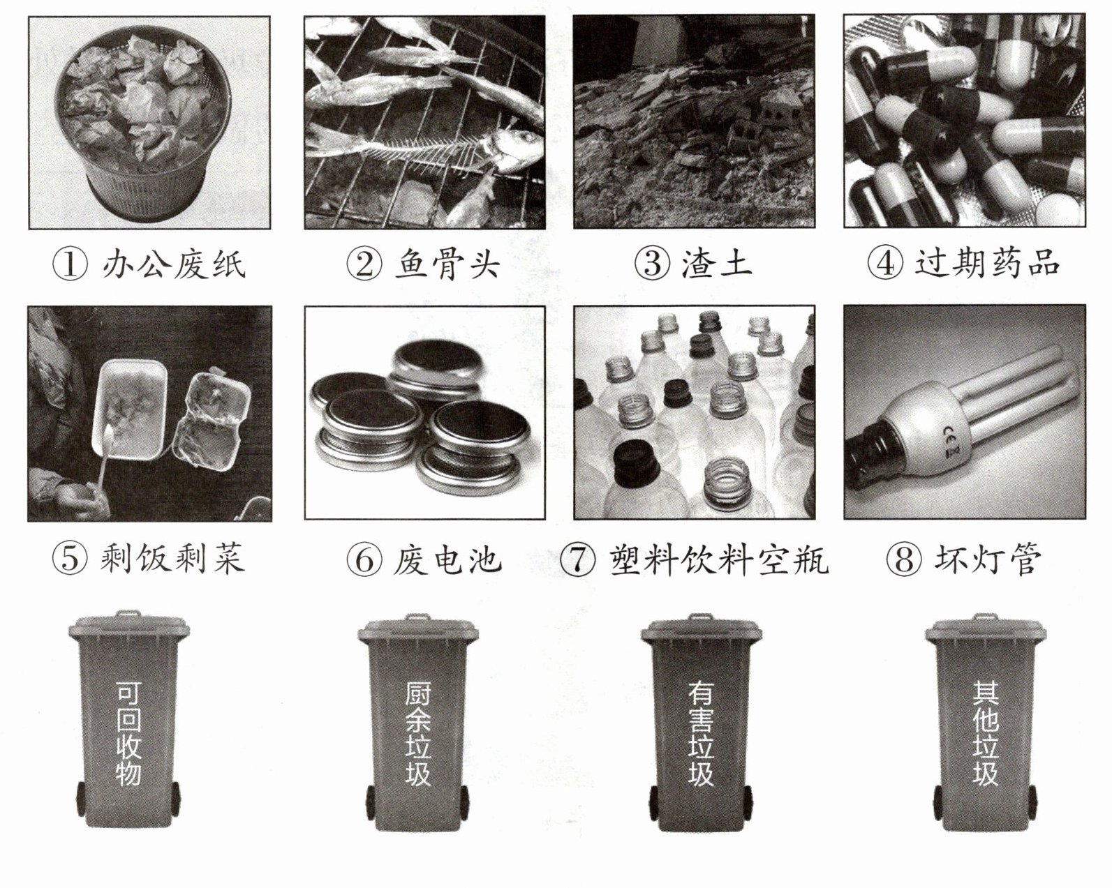 可回收物:①⑦ 厨余垃圾:②⑤ 有害垃圾:④⑥⑧ 其他垃圾:③
