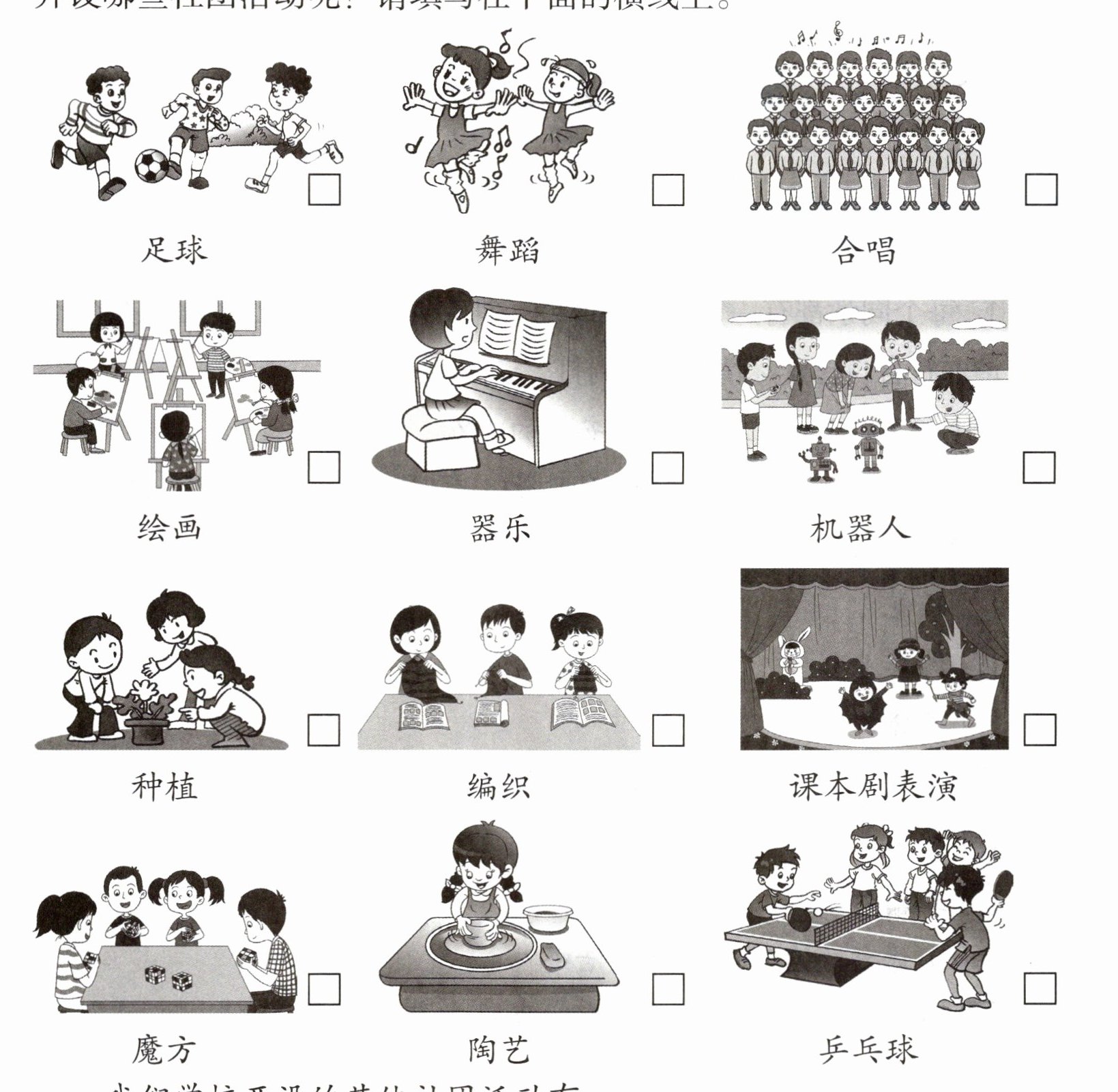 2. 你们学校开设以下社团活动了吗?如果开设了,请在□内打“√”。除此之外,你们学校还开设了哪些社团活动?你还希望学校开设哪些社团活动呢?请填写在下面的横线上。