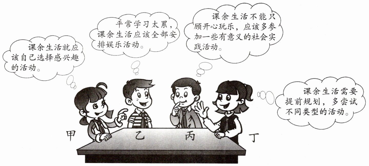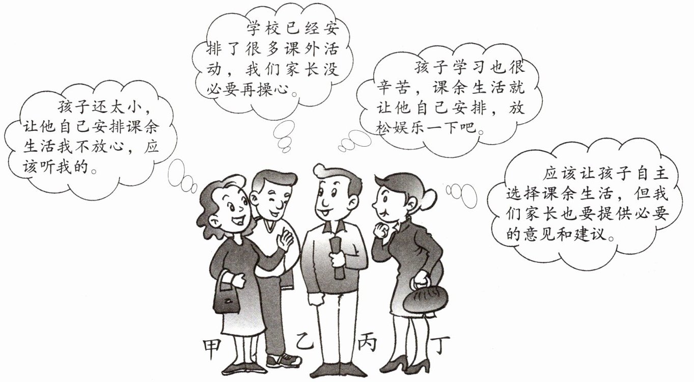 2. 课余生活应该由谁选择、如何选择与安排呢?下面几位家长和同学的观点,你支持谁的呢?请把你的观点填写在图下横线上。