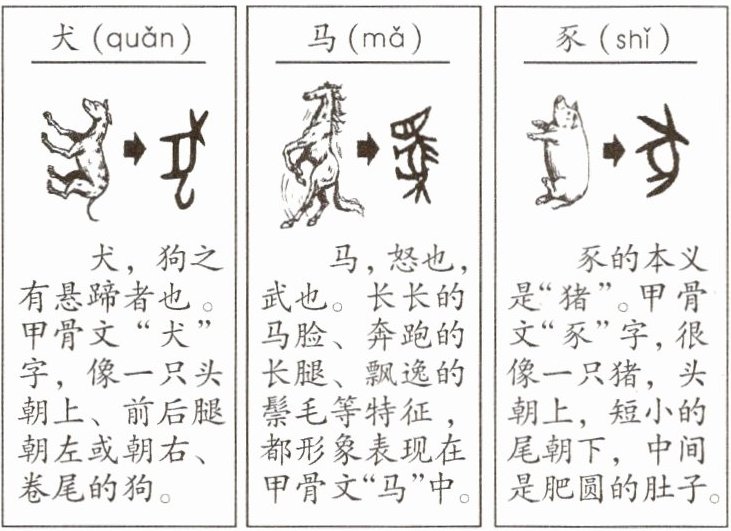小语:早在远古时期,狗、马和猪这三种动物就被我们的祖先饲养,成为家畜。你看,在甲骨文中古人用线条把动物的外形特征惟妙惟肖地勾勒出来了。