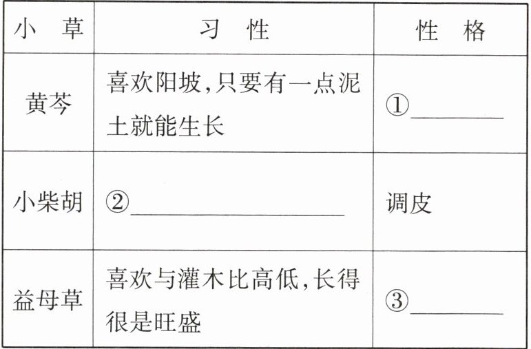 7. 文中提到“山中的小草”有各自的性格,请你依据对文本的理解,填写表格。