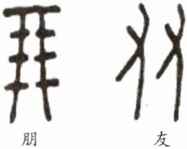 【注释】“朋”字本义为并列系在一起的两挂贝壳。“友”字字形像顺着一个方向的两只手,表示以手相助。