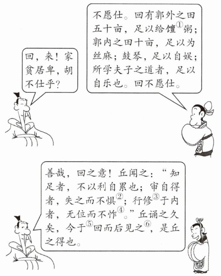 12.示例:课文中颜回即使生活清苦、困顿,也自得其乐。选文中,颜回懂得知足,不被名利所累,正确对待得失,注重内在修养,使自己无论在何种环境下都能保持从容与坦然。由此可见,颜回是一个居于陋巷而不改其乐的安贫乐道之人。